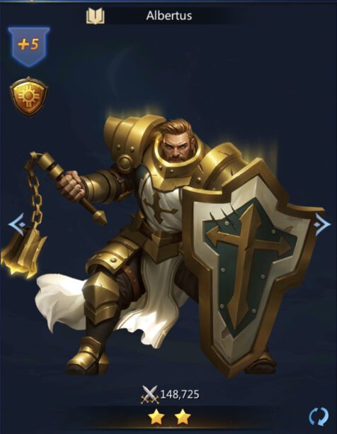 Albertus is the two star hero. His element is Light. He belongs to the Economic Heroes that increase the indicators of the Economy.